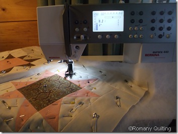 As it was the school holidays our President Brenda – who works as a teacher, could come along and join in with the group. She was sewing the binding down on a “Shabby Chic” 60th birthday quilt. The centre blocks were a very pretty hydrangea print in pinks and lilacs.