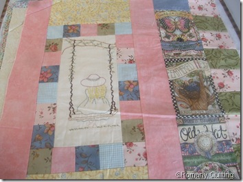 Then we saw a jeans quilt with a difference. Who would have known that jeans are available in such glowing colours? Virginia’s quilt glowed with colour, red, green, yellow, and some denim blue too, and was fun to make, she said. Jeans pockets and labels add extra interest.