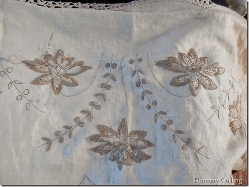 Janelle and Sara were chatting away together as they worked on their projects. Both these girls do lovely work so I had to check out their progress. Janelle does exquisite needle turn and was starting to appliqué vines with 3D buds. She needs nine big blocks like this, she told me, to make a bed quilt for herself.