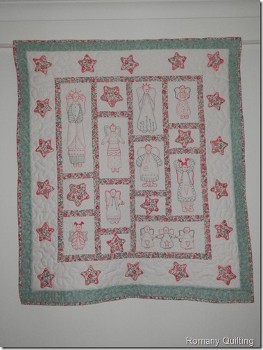 There was one blue embroidered doily which didn’t seem to go with all the others. But, as it turns out, I will shortly be attending a class on how to sew with doilies. I have decided to start making myself a new bag at this class to keep my stitchery projects in. So this blue doily will be getting a new lease of life, and I backstitched my name in the centre panel which will be cut out and centred on the front of the bag.
